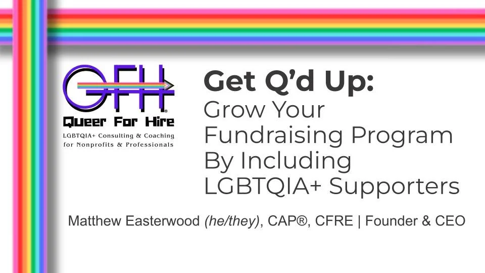 Queer For Hire provides fundraising support and training for nonprofits and fundraising teams of all sizes and levels. Contact us at Matt@QueerForHire.com to stay in touch. Learn more about our Fundraising Services <here> and Fundraising Trainings <here>.
